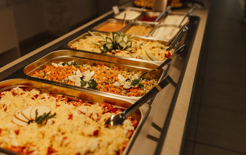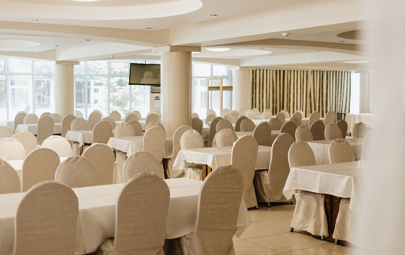 На выбор гостям предлагается несколько вариантов питания: завтрак «шведский стол», 3-разовое «шведский стол» или без питания. На территории комплекса есть ресторан «Жемчужный», кафе «Панорама», караоке-бар COSMOS, пиццерия, Летняя веранда и Шашлычная.